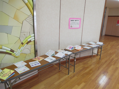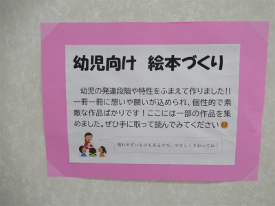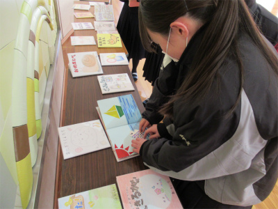 3年生、家庭科の授業において2学期に取り組んだ「絵本づくり」の展示が行われています。