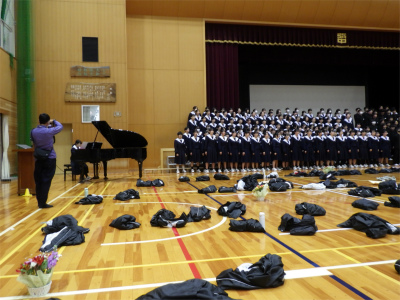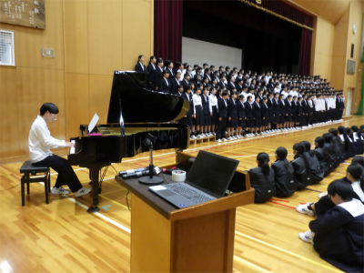 在校生からの贈り物と花束の贈呈の後、3年生からは感謝の気持ちを込めて、卒業式で歌う合唱曲が披露されました。その歌声は、これまで学校を支えてきた3年生の思いが伝わる、心に響くものでした。