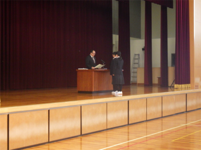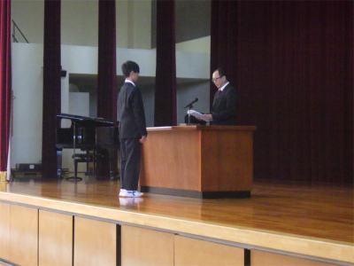 修了式が行われ、代表が修了証を受け取って、1年生224名、2年生217名が各学年を修了しました。校長からは「1年を振り返り、さりげない優しさを実践できたか」「春休みを自分の未来・進路をつかみとるために、何が大切かを考える機会にしてほしい」との話がありました。生徒指導主事からは春休みの生活で気を付けてほしいことについての話がありました。